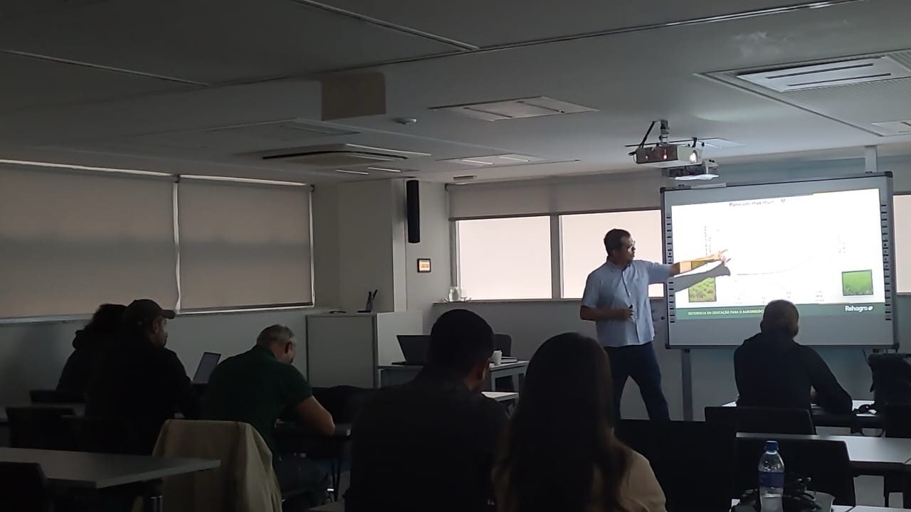 Responsável pelo módulo de Manejo da Pastagem, o professor compartilhou seus conhecimentos em uma das salas do Centro de Treinamento da OCEMG (Organização das Cooperativas do Estado de Minas Gerais), abordando práticas essenciais para a gestão eficiente de pastagens voltadas à produção de leite.