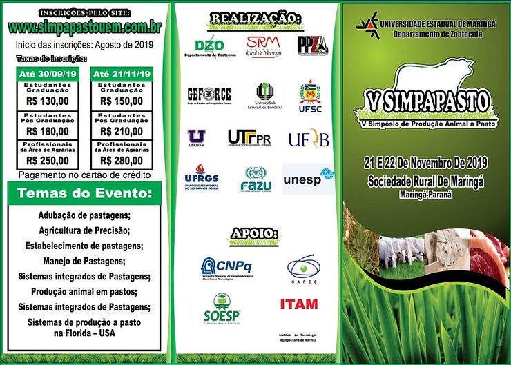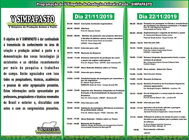 Nesta edição, o SIMPAPASTO abordará os seguintes temas: Adubação de Pastagens; Agricultura de Precisão; Estabelecimento de Pastagens; Manejo de Pastagens; Sistemas de Produção a Pasto na Flórida-USA; Produção Animal em Pastos; Sistemas Integrados de Pastagem.