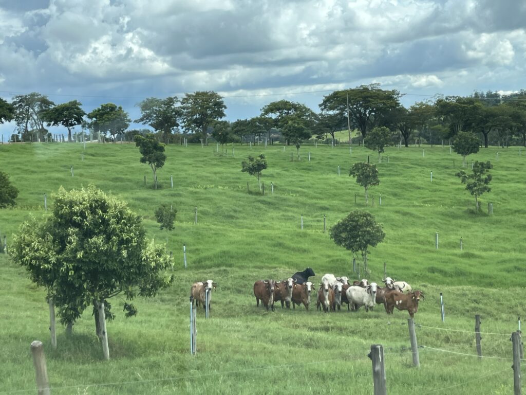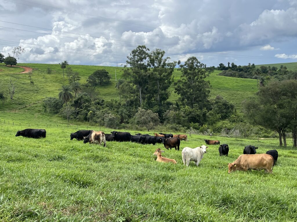 Durante a visita de trabalho realizada em fevereiro de 2026, os sistemas irrigados 1, 2, 3 e 4 da Fazenda Central estavam sendo pastejados por vacas doadoras da raça Gir e receptoras cruzadas, suplementadas apenas com suplemento mineral. Nessas áreas, formadas por capim Tifton 85 irrigado por aspersão em malha, a taxa média de lotação foi de 7,5 cabeças/ha e 6,7 UA/ha. Anualmente, essas pastagens passam por correção e adubação do solo.
